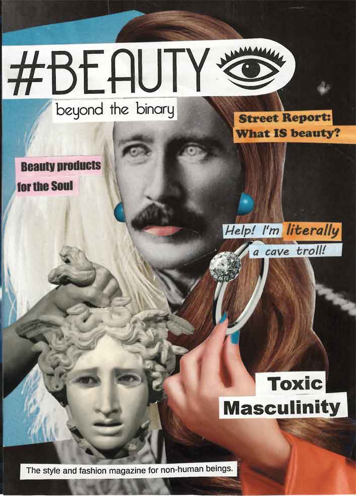 The cover features a composite face with pale eyes, a mustache, long hair and lipstick as the main feature. the magazine is called #Beauty: beyond the binary". The articles listed are:
