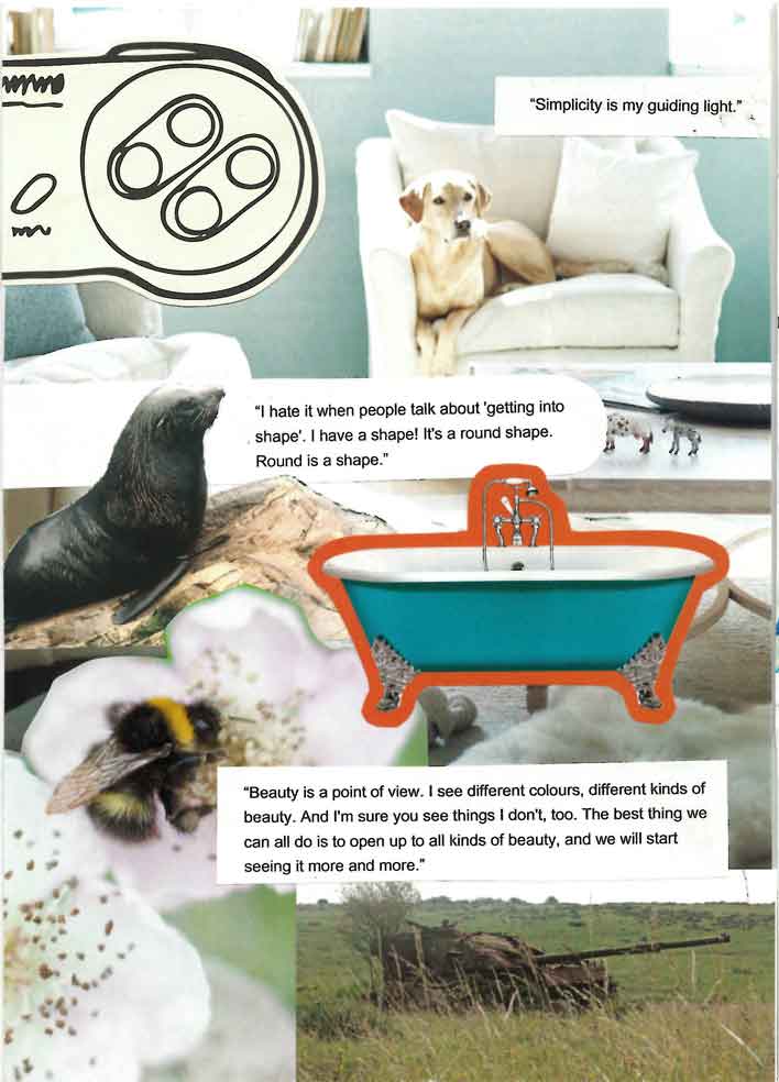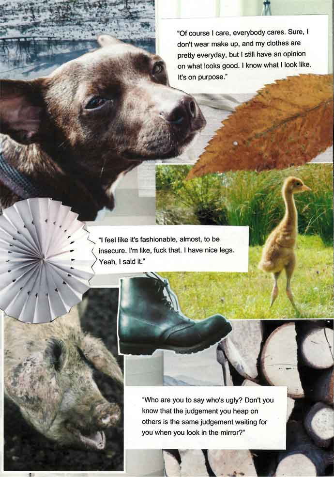 This page features a collage in brown and pinks, featuring ice cream, giant lipsticked lips and a pink shoe.