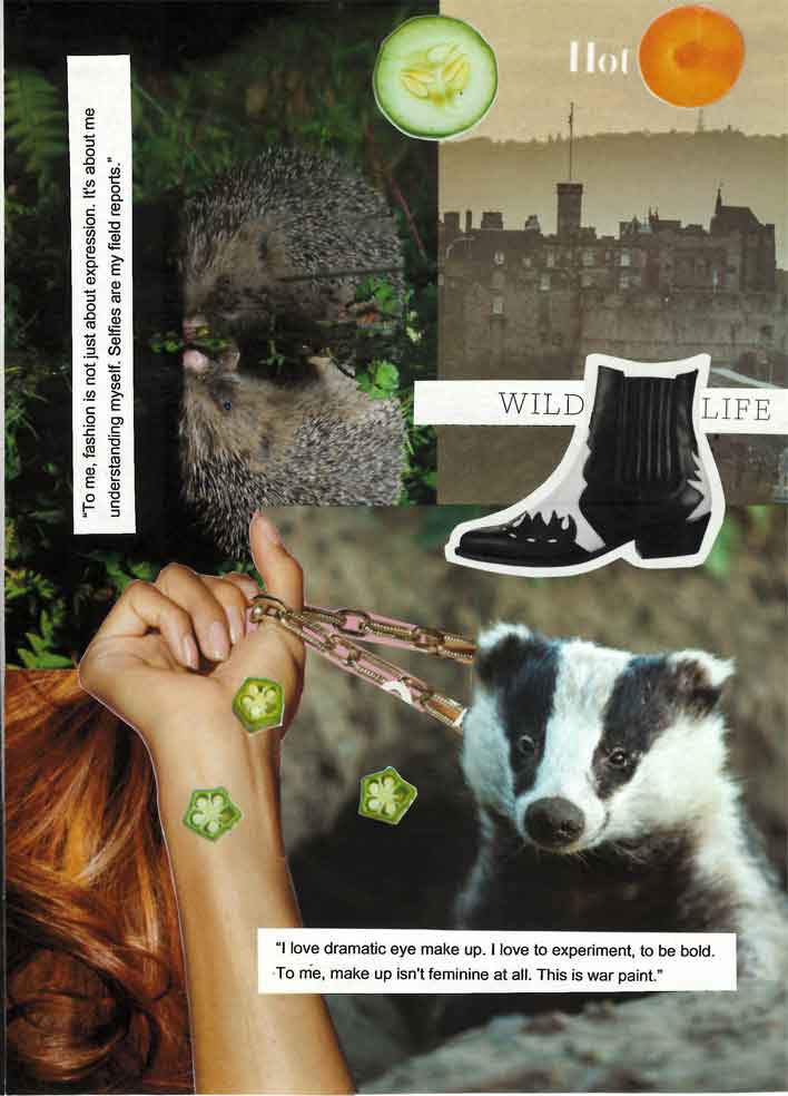 A hedgehog looks into a puddle at her reflection. "To me, fashion is not just about expression. It's about me understanding myself. Selfies are my field reports."A badger looks straight in the camera: "I love dramatic eye make up. I love to experiment, to be bold. To me, make up isn't feminine at all. This is war paint."