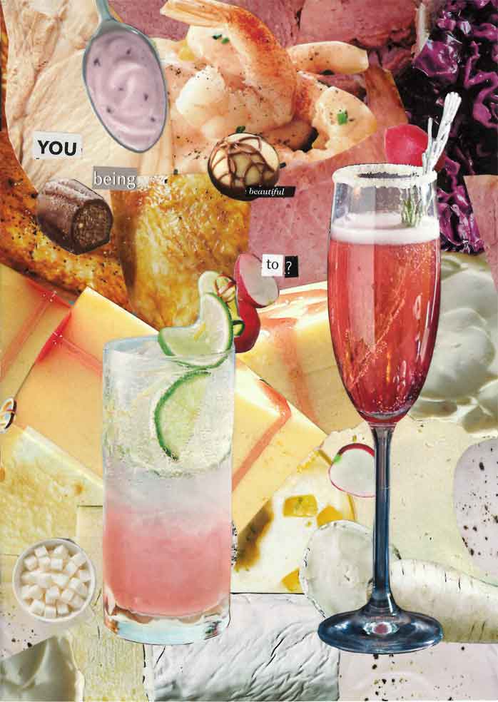 This page and the next feature a collage rainbow of food with fancy cocktails in the foreground.