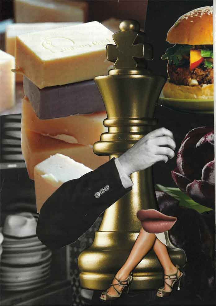 A collage page featuring stacked soap, a burger, the king from a chess game, a man's arm, a woman's legs and lips, a black tulip.