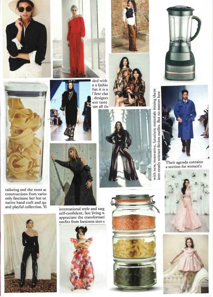 This page features models wearing clothes and walking runways juxtaposed with kitchen products. Snippets of fashion commentary don't quite add up to meaning.