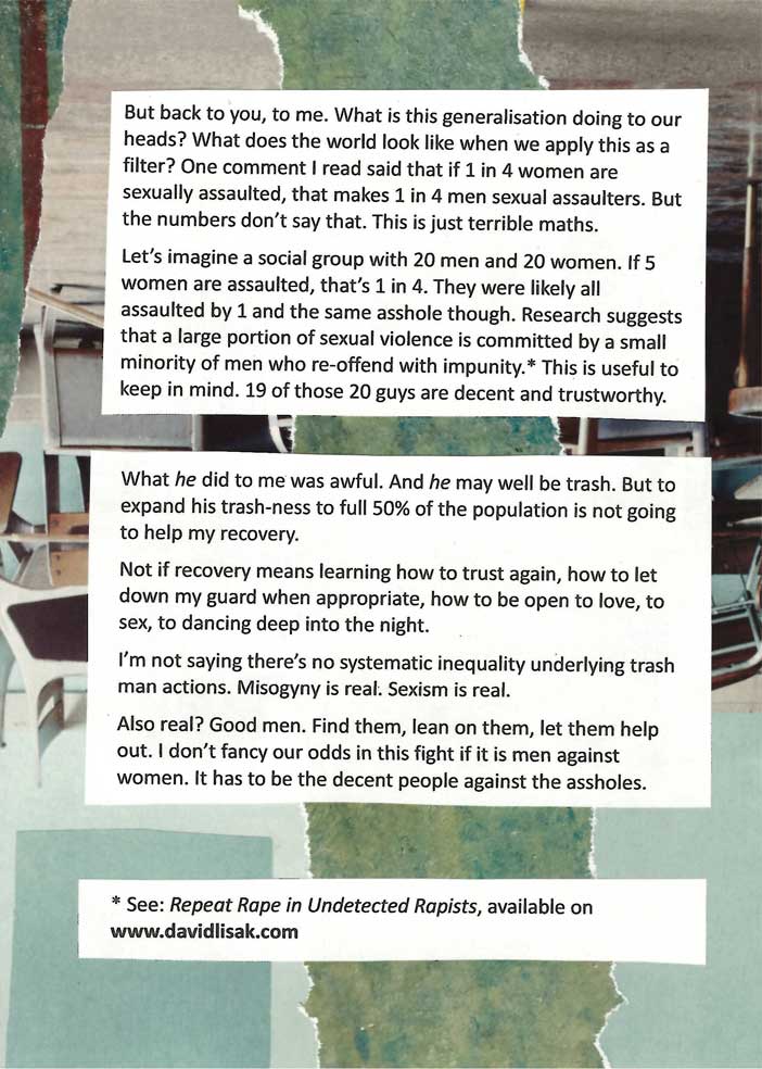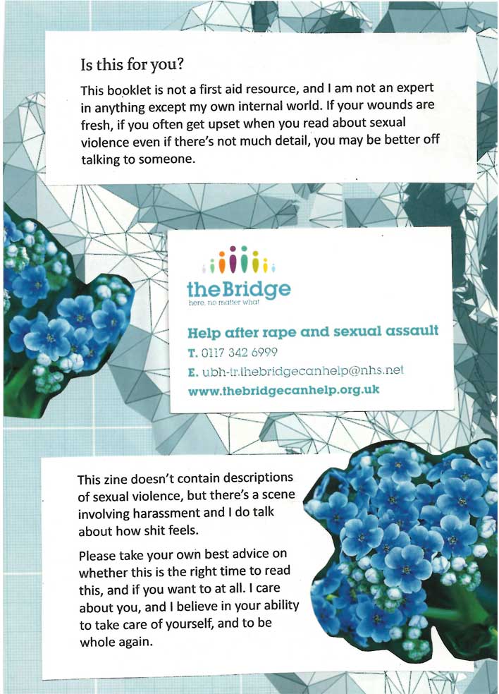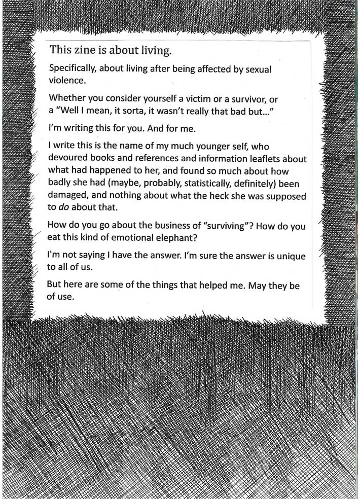 This is a zine about surviving sexual violence. We often talk a lot about the immediate trauma and not so much about how, with the years, it can be something that stays with you without defining you. It’s part of our histories for so many of us, and it remains difficult to talk about. So although I wrote this in 2018 and I don’t fully agree with everything I said in it, I humbly offer it, unedited, in its entirety in the hopes it is of use.